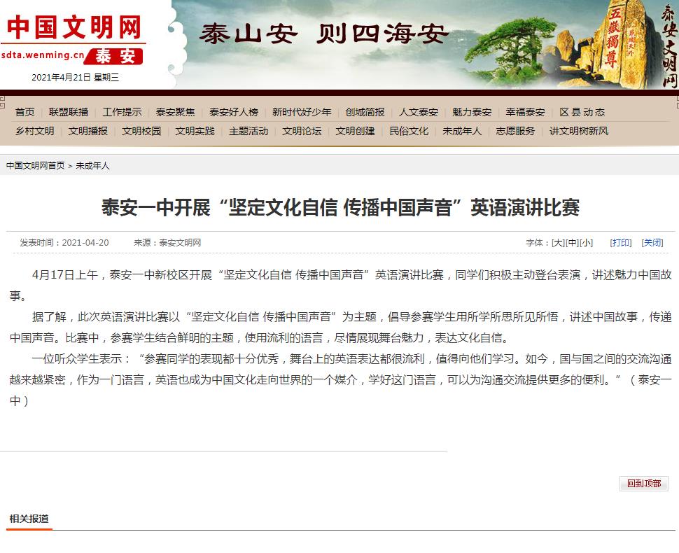 文明网:泰安一中开展“坚定文化自信 传播中国声音”英语演讲比赛