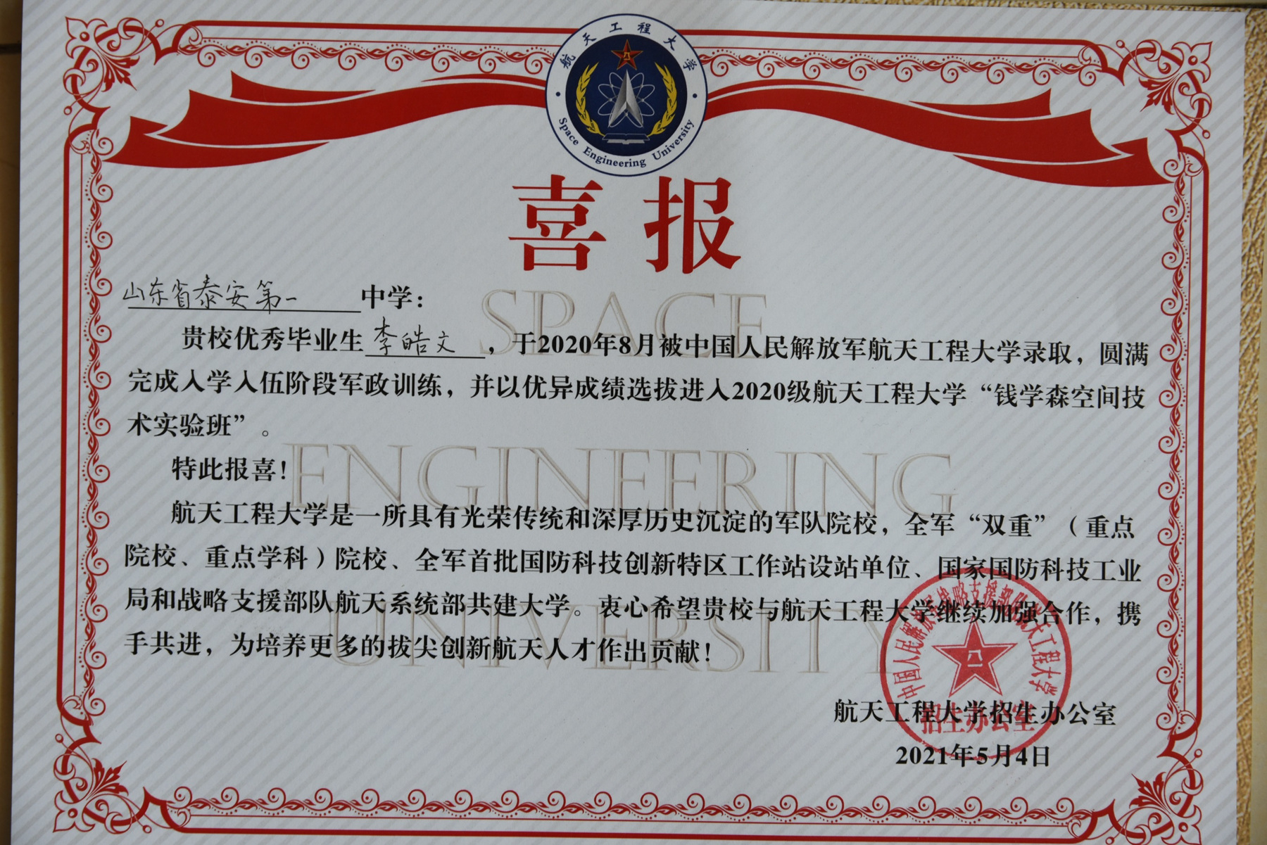 中国人民解放军航天工程大学向我校发来喜报