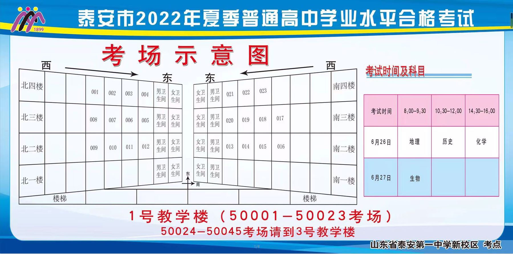山东省2022年夏季普通高中学业水平合格考试泰安一中新校区考点考场分布
