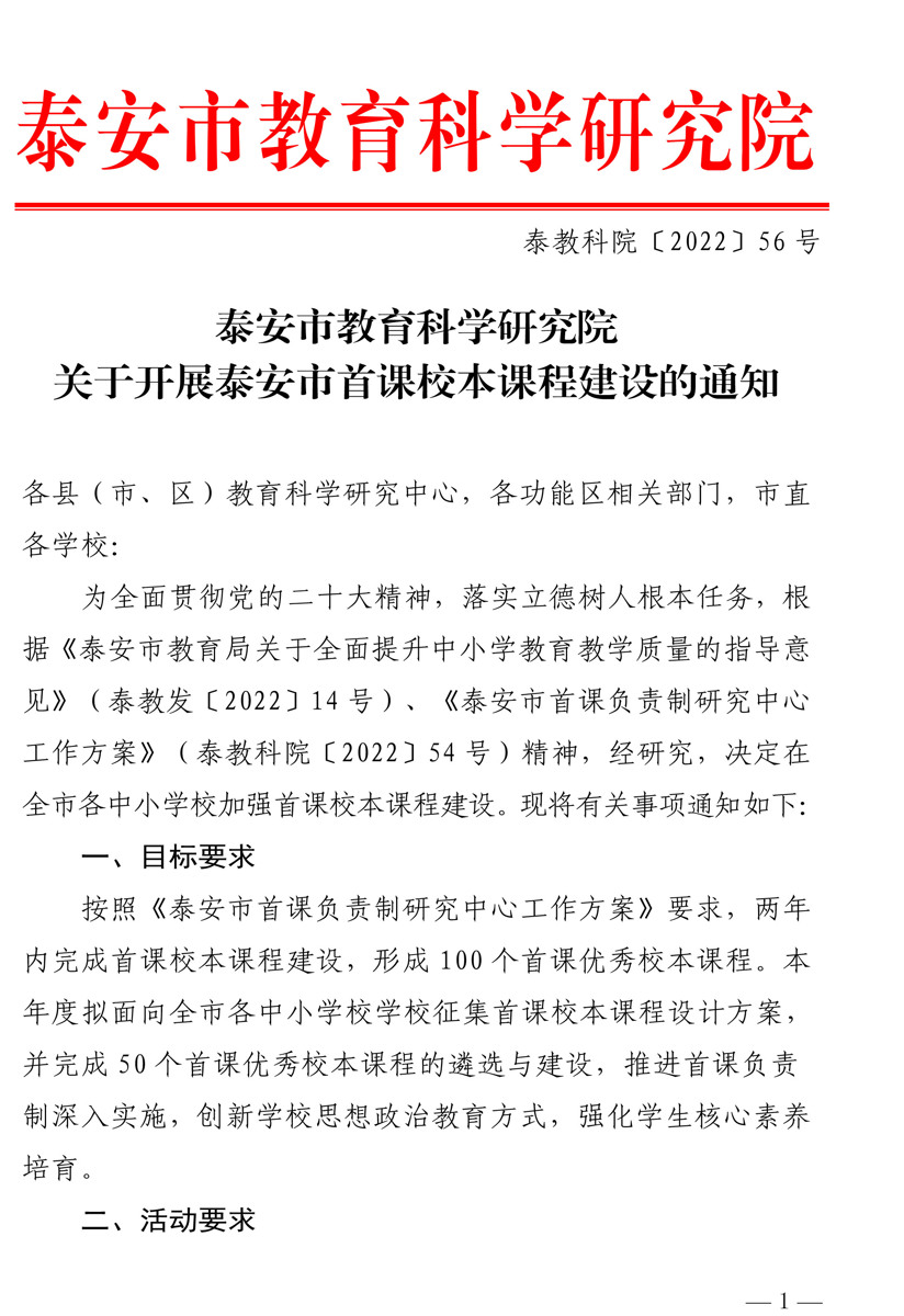 泰教科院(2022)56号关于开展泰安市首课校本课程建设的通知