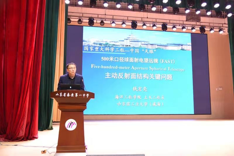 授牌仪式结束后,哈尔滨工业大学(威海)的领导和专家来到新校区小剧场,为400余名师生作了精彩的专题报告。张淑娣书记介绍了哈工大威海校区的办学特色、办学理念及丰硕的办学成果;姜永远处长对相关招生政策进行了解读;钱宏亮院长作了题为《500米口径球面射电望远镜结构关键技术研究》的学术报告,通过大量的图片视屏展示和深入浅出的讲解,让同学们生动形象地了解了射电望远镜及其工作原理,也深深感受到了钱院长求真务实、开拓创新的科学精神。全体同学纷纷表示,将秉持科学精神,树立远大目标,坚定学习信念,勇攀科技高峰,为中华民族的伟大复兴贡献青春、智慧和力量。
