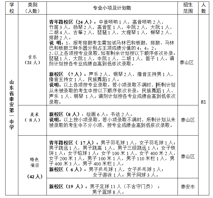 2021年泰安一中艺体特长生招生计划