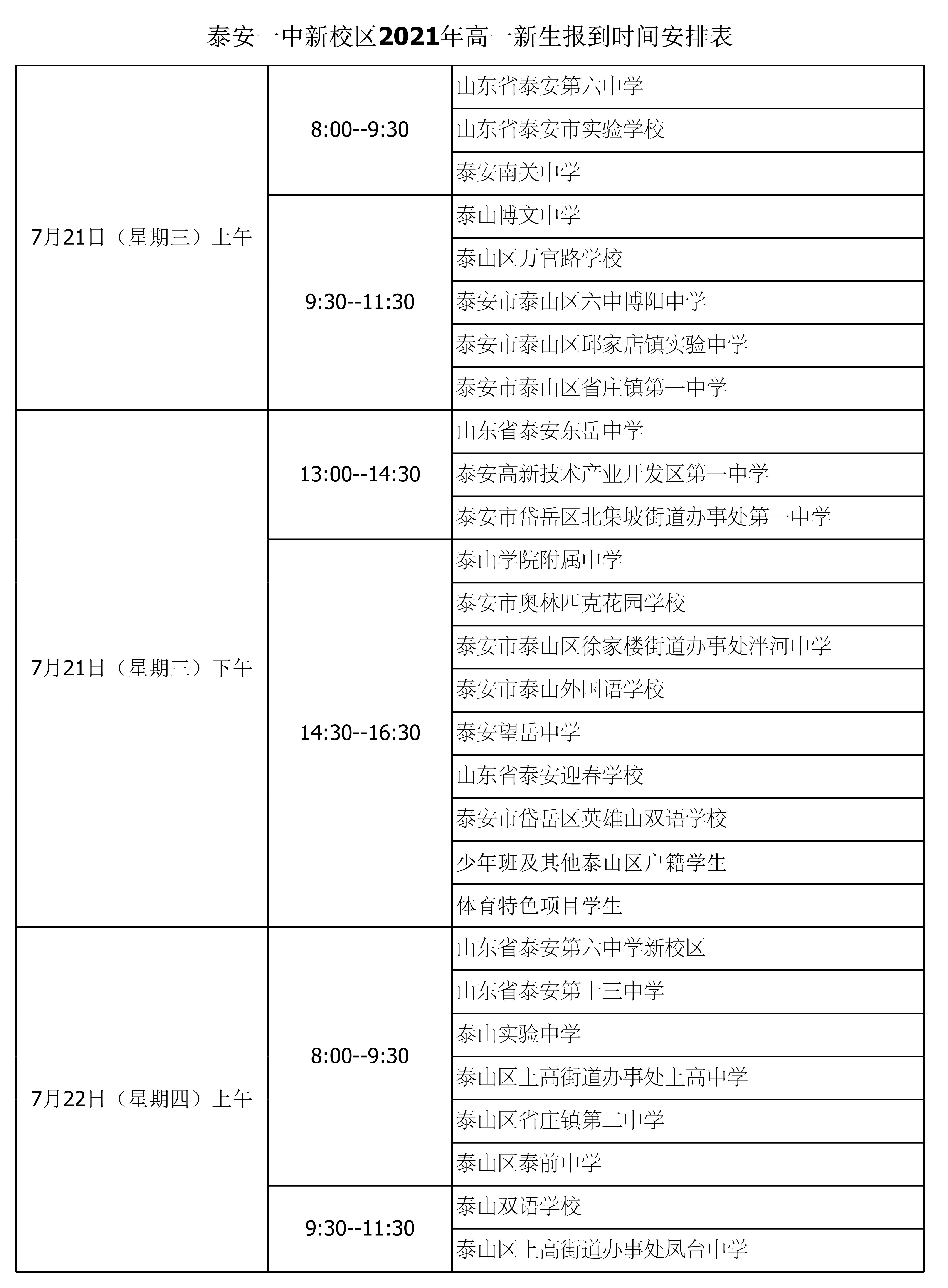 泰安一中新校区2021年新生报到时间安排表